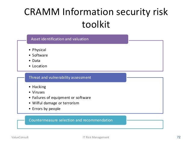 • CRAMM (CCTA Risk Analysis and Management Method) is a risk management methodology, currently on its fifth version, CRAMM Version 5.0.