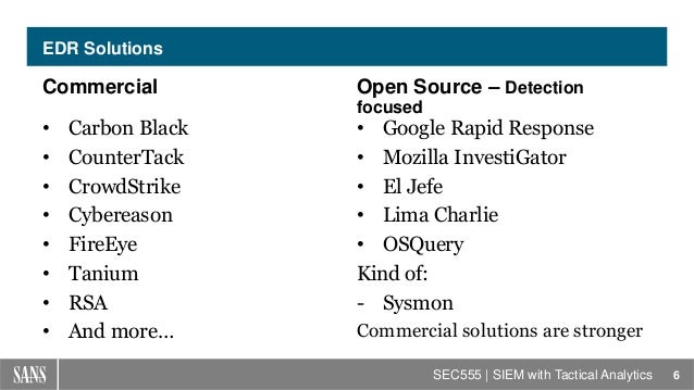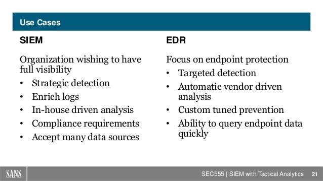 An EDR is seen complimentary to traditional means of protection like signature-based tools or a SIEM.