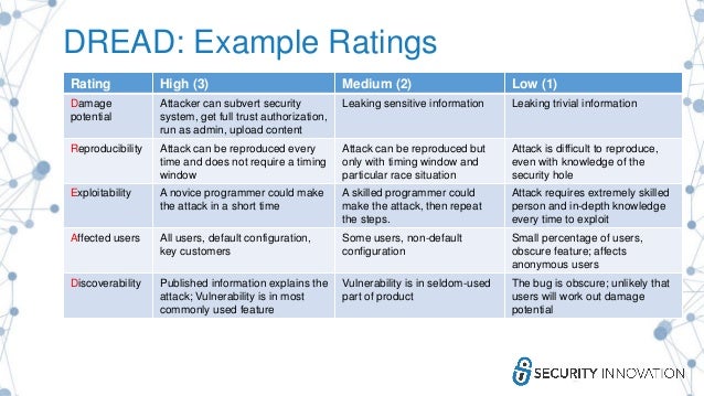 DREAD methodology is used to assess, analyze, and find the probability of risk by rating the threats as described in the image below.